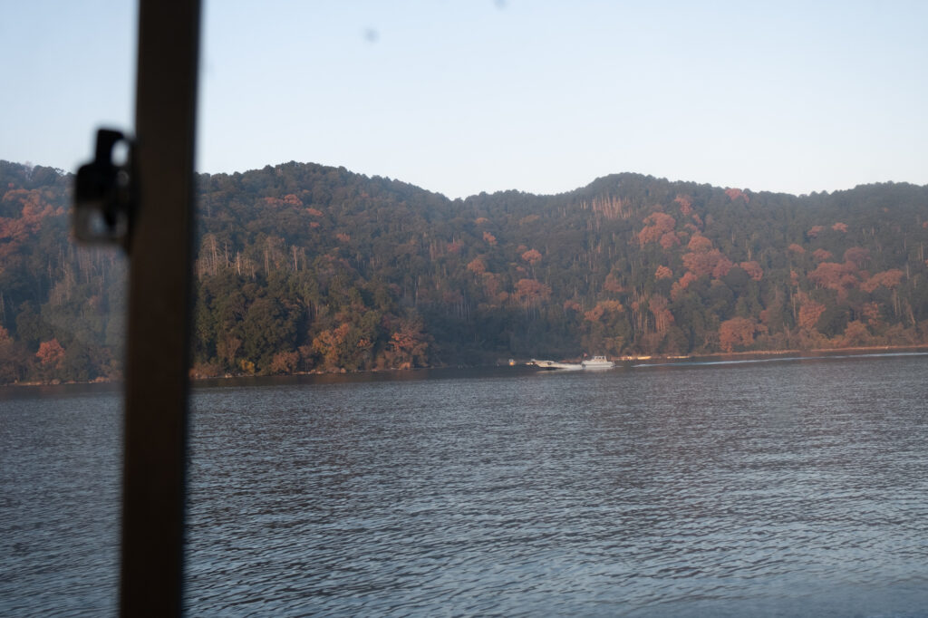今回は、以前より1本早めの16時台の船に乗船できました。湖上荘から見える夕日が綺麗と聞いていたので、明るい時間に乗船です。